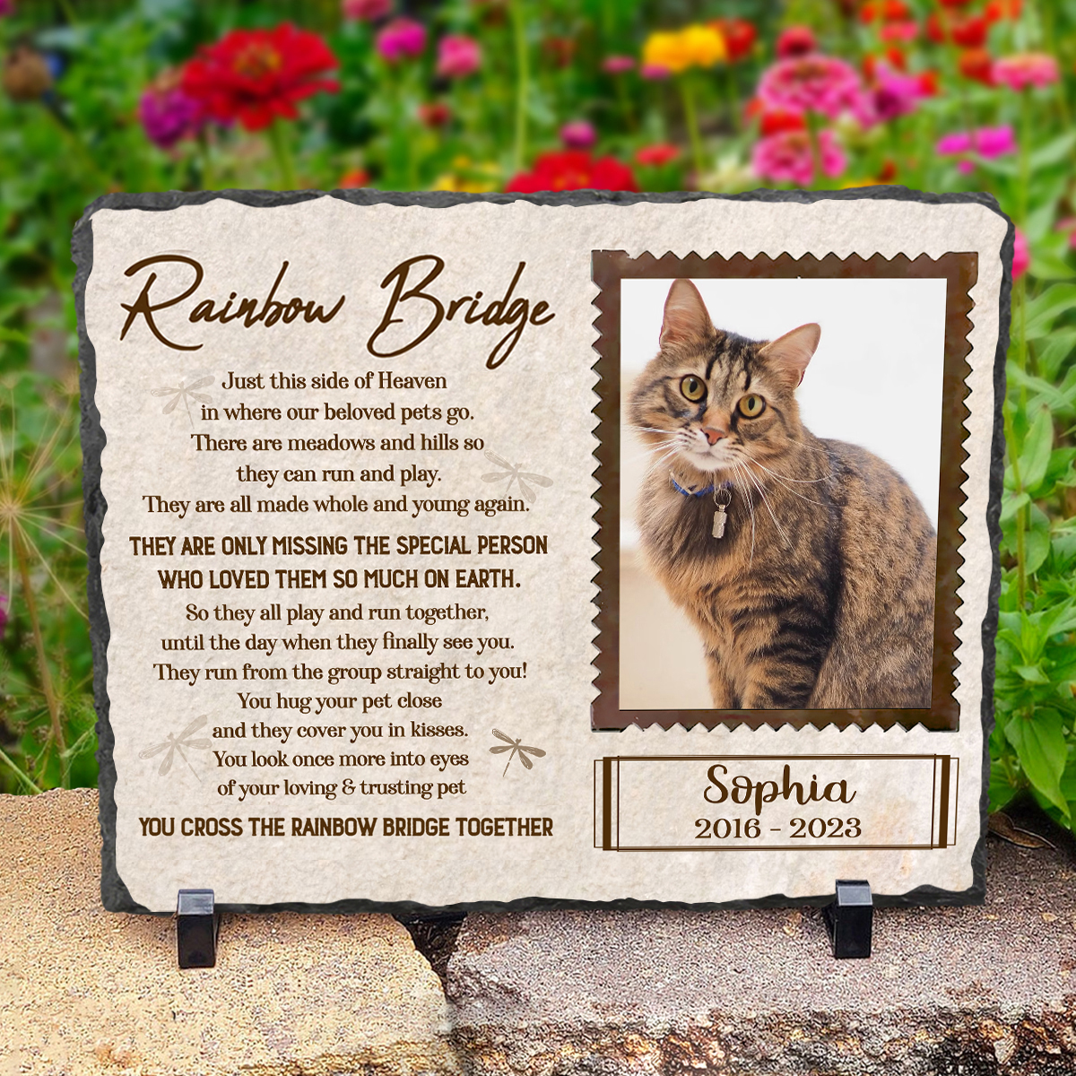 Rainbow Bridge – Personalized Cat Memorial Stone – Rectangle Rock Slate With Stand – Sympathy Gifts for Pet Lovers